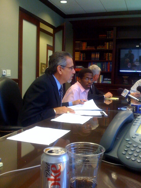 As one of the children looks on, attorneys Howard Talenfeld and Ted Babbitt discuss their federal lawsuit against New York City's Administration for Children's Services in the case of Judith Leekin's abuse of the foster care system and 10 children in her care.