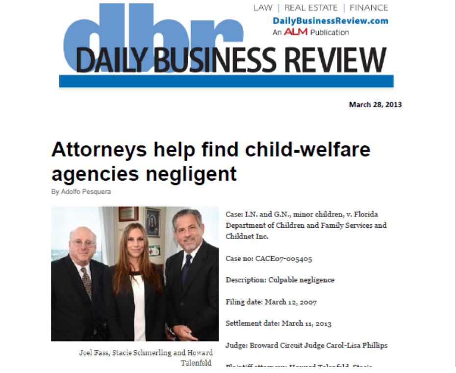 A $2.2 million settlement negotiated by attorneys for two young girls who were repeatedly sexually abused by their mother, even after experts warned and judges admonished community based care provider ChildNet Inc., and the Florida Department of Children and Families, recently was profiled in South Florida publication, Daily Business Review.